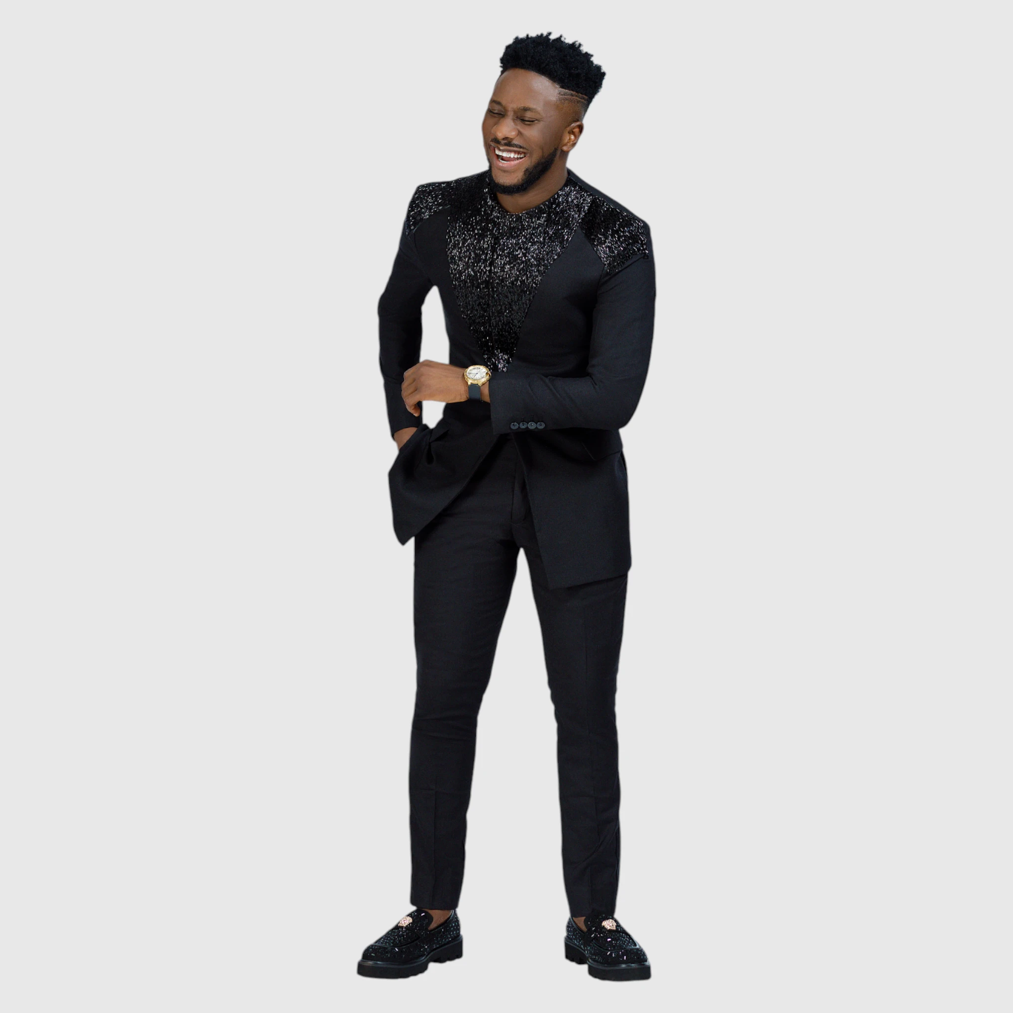 Crafted from premium Paladino wool and elevated with meticulous hand-beaded detailing, the Black Safari is a statement in refined luxury. This two-piece set redefines elegance with its sleek silhouette and intricate beadwork, delivering a bold yet sophisticated presence.