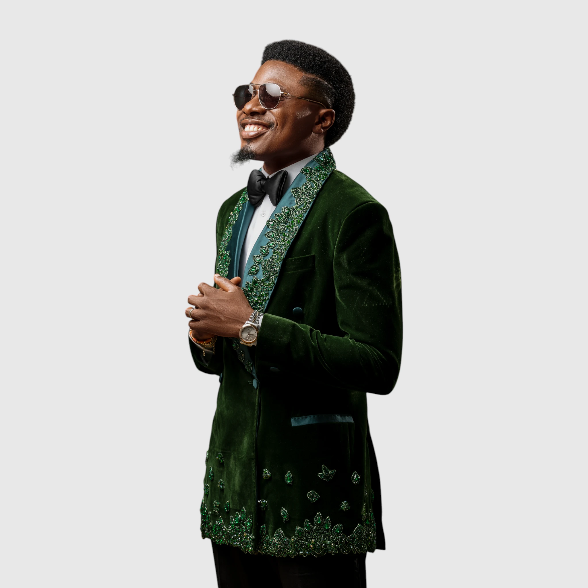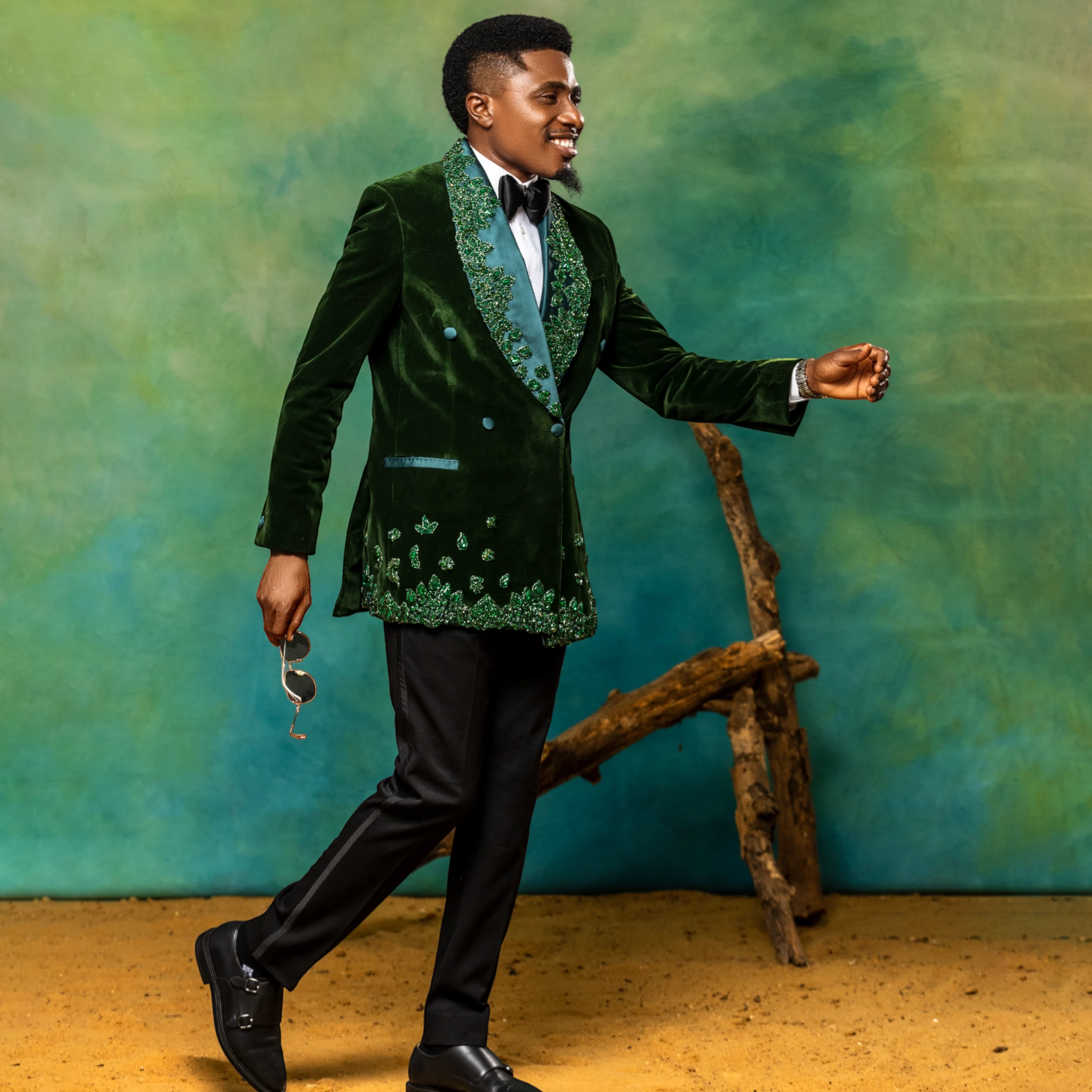 Rich, bold, and unapologetically refined, the Emerald Green Velvet Tuxedo is designed for men who command presence. The deep velvet fabric is elevated with intricate embroidered embellishments along the lapel and hem, creating a regal finish. With its double-breasted cut and satin-trimmed lapels, this tuxedo strikes the perfect balance between modern luxury and timeless elegance. Paired with black tailored trousers, it is the ultimate look for black-tie events, galas, weddings, and grand occasions.