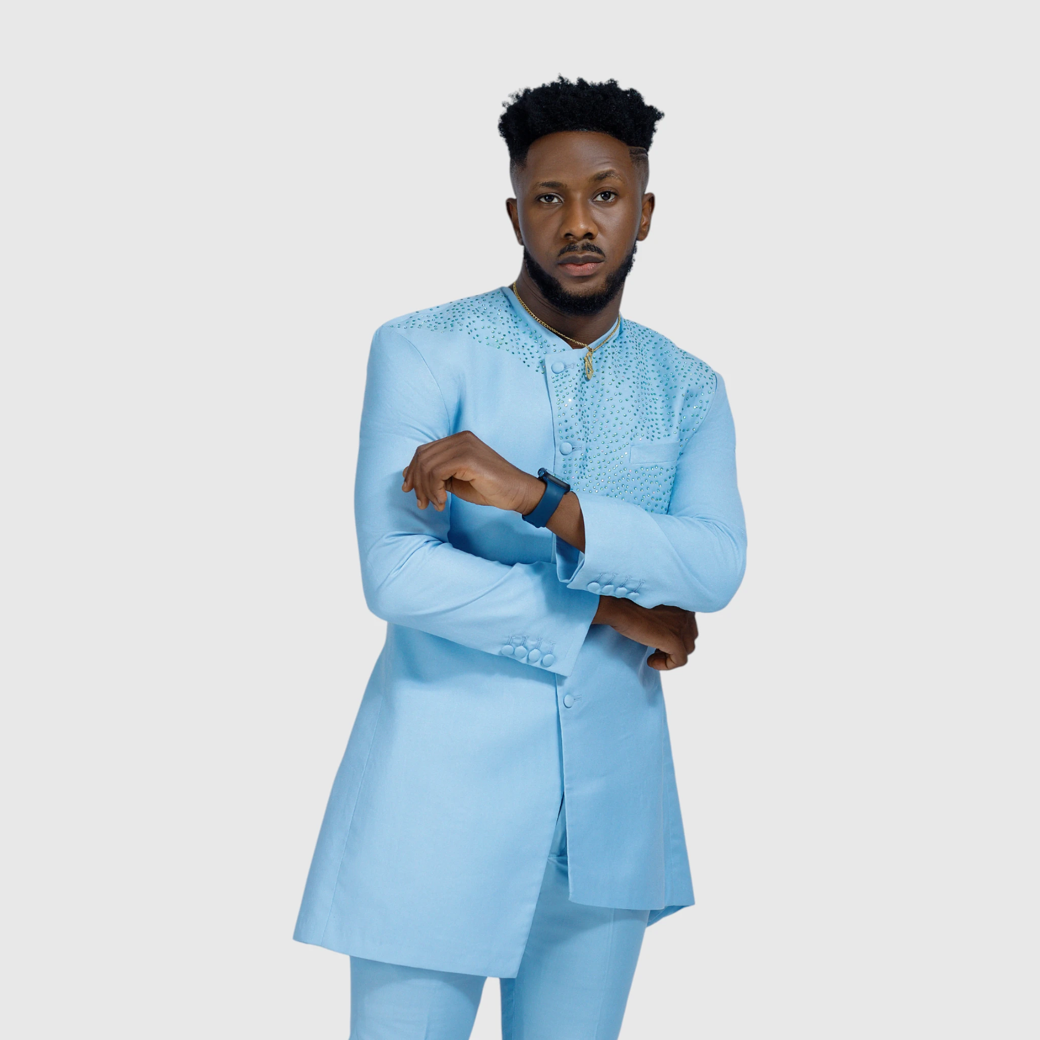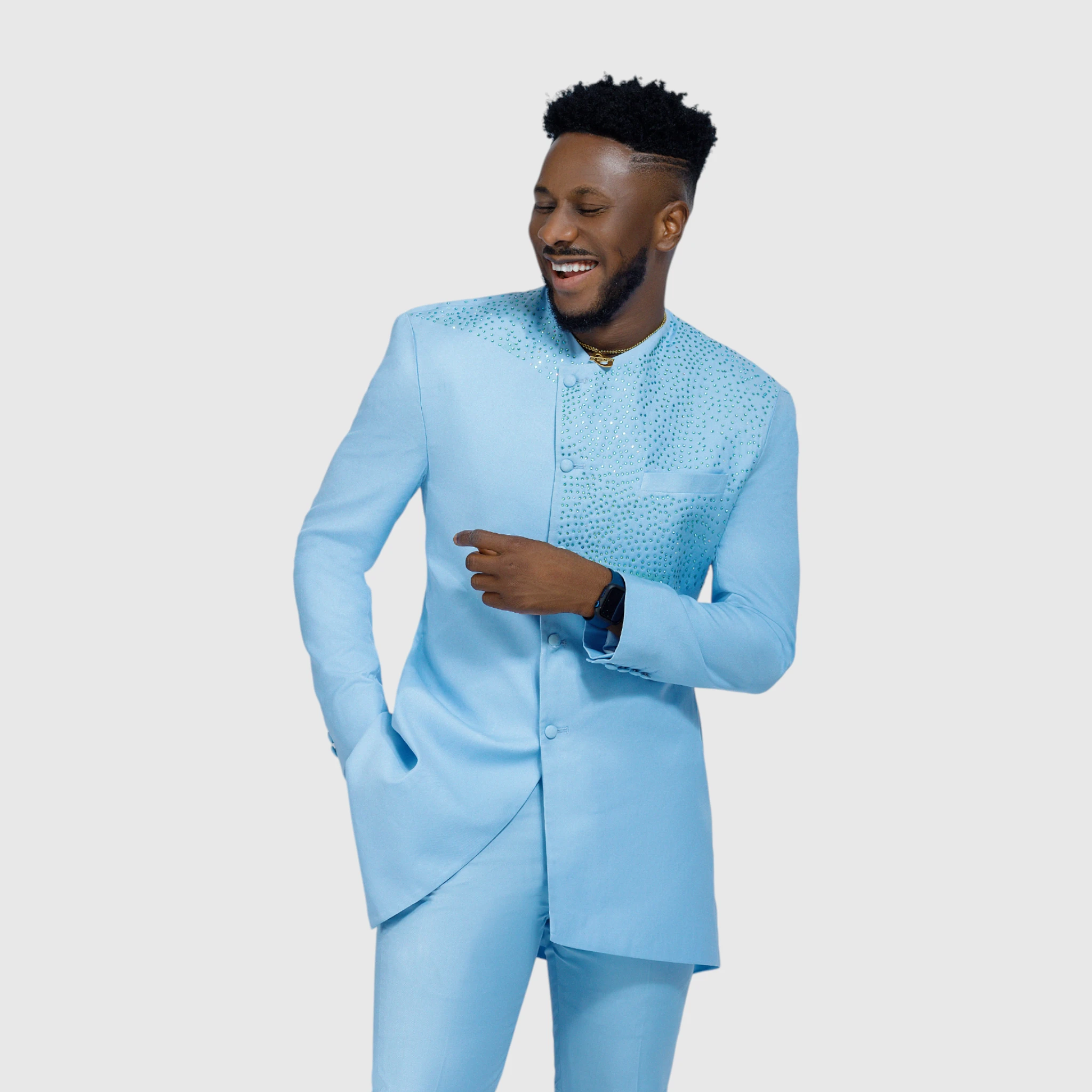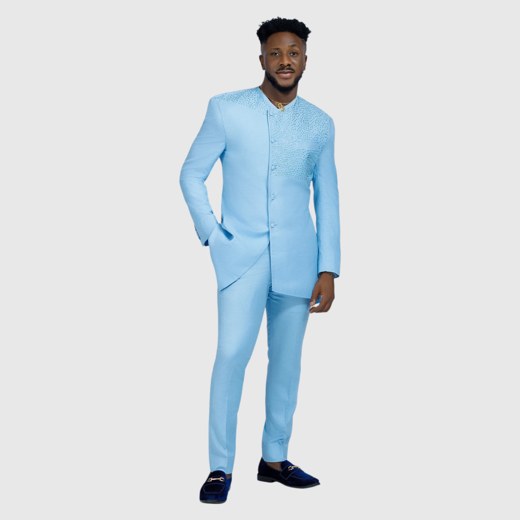 Stand out in timeless elegance with the Sky Blue Modern Safari 2-piece. Crafted from 100% Grade C Cashmere and adorned with intricate hand-stoned detailing, this suit blends modern sophistication with classic safari tailoring. Its vibrant sky-blue tone makes a bold yet refined statement, perfect for corporate gatherings, stylish occasions, or upscale casual events.