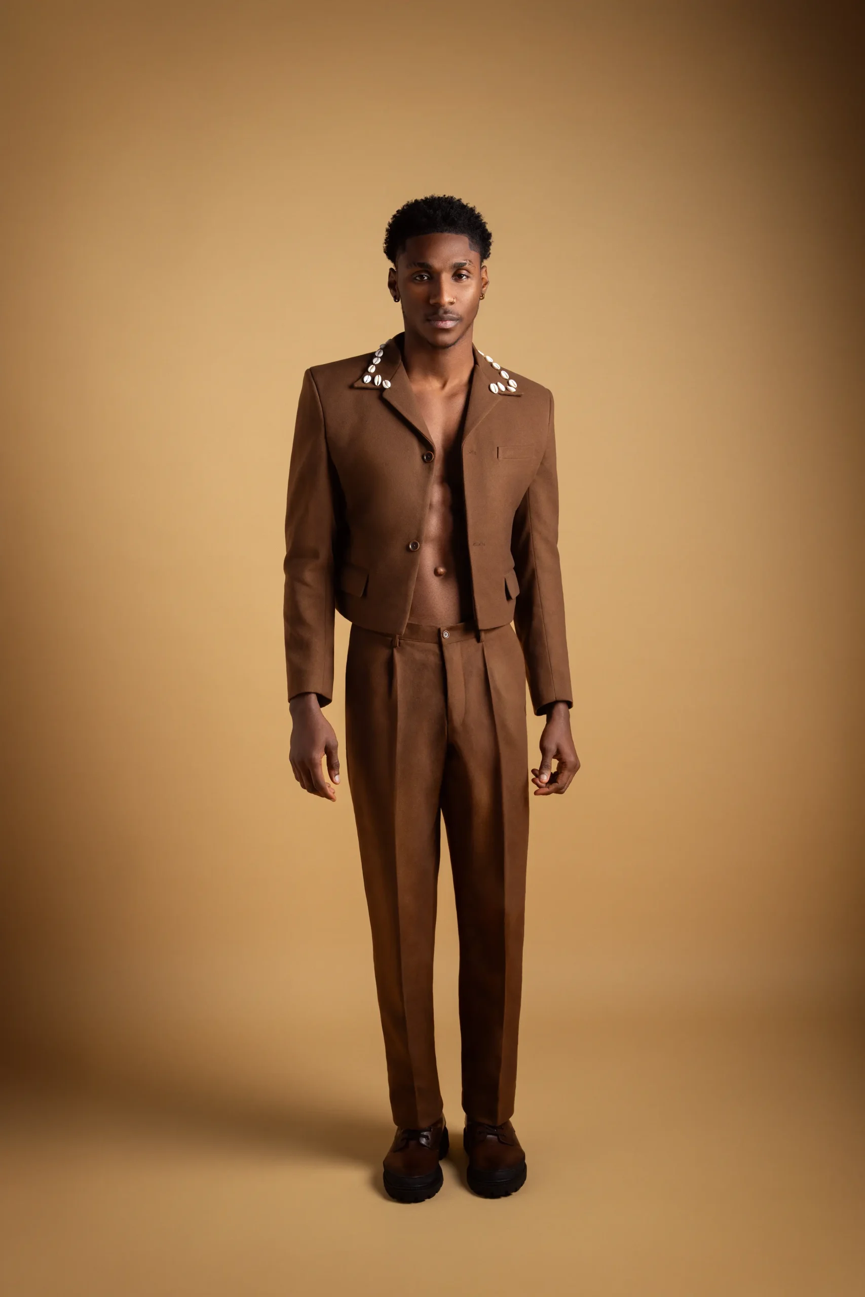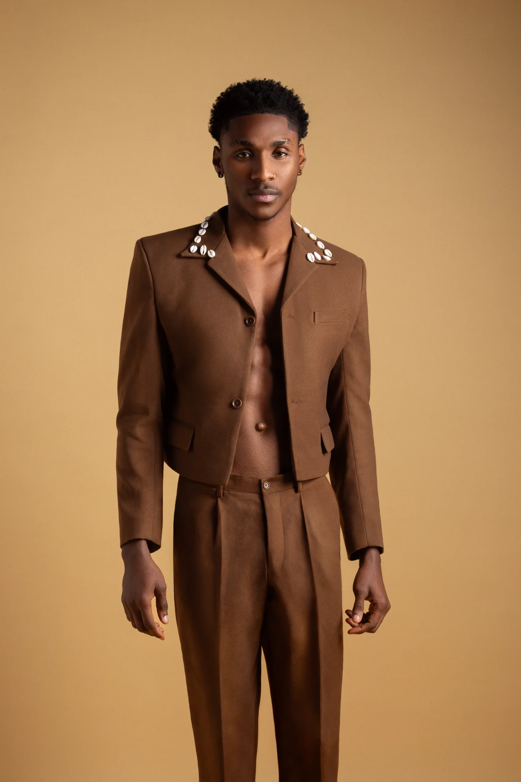 A sharp reinterpretation of tailoring, this cropped jacket with cowrie shell-embellished collar is paired with relaxed wide-leg trousers. Designed for the modern man seeking structure with cultural depth.
