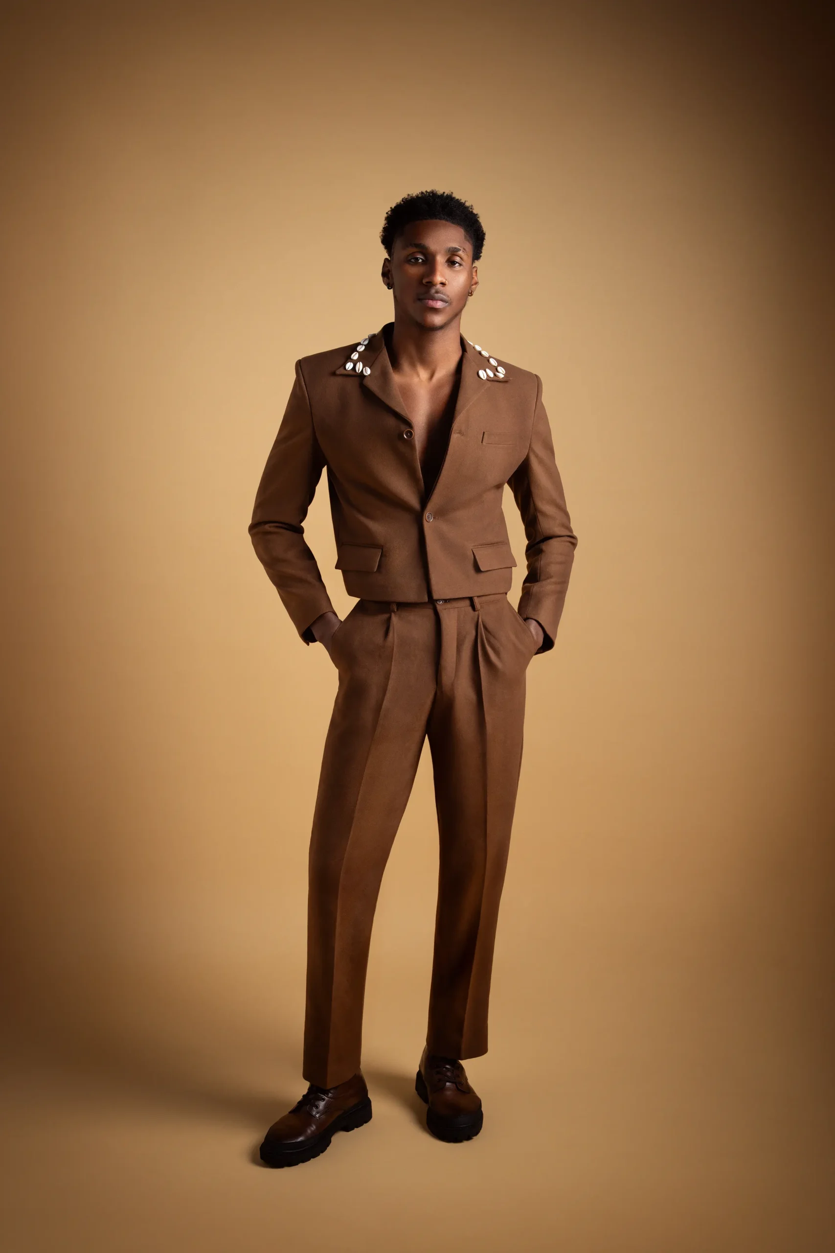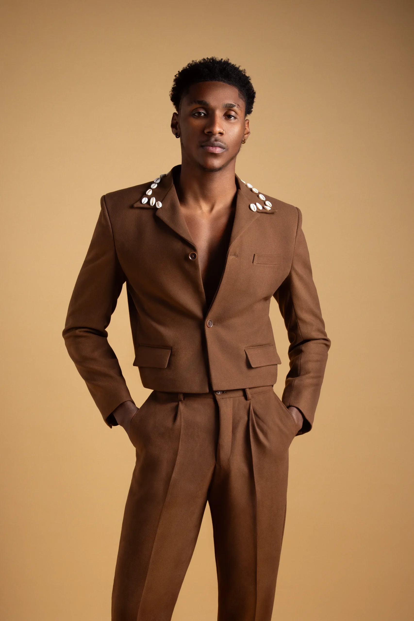 Cowrie shells symbolizes prosperity and protection, transforming classic tailoring into a piece rooted in heritage.